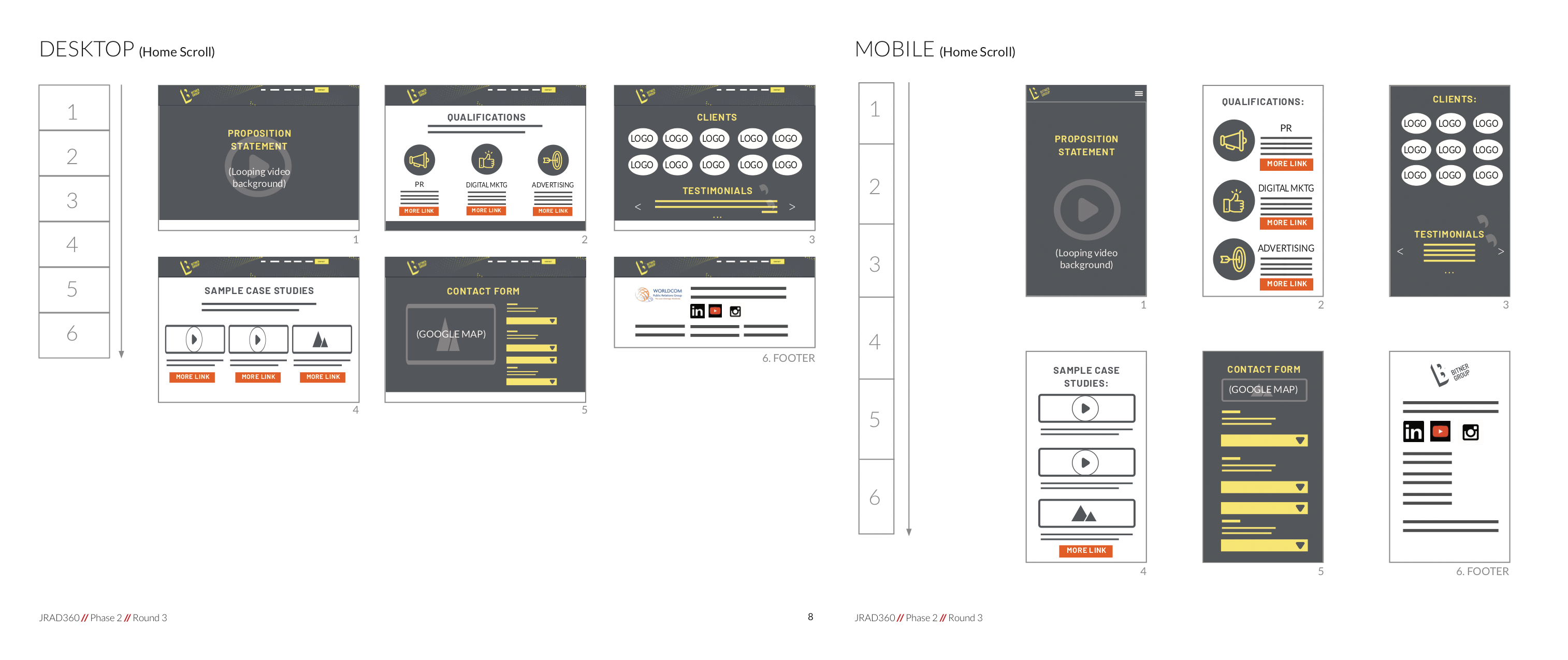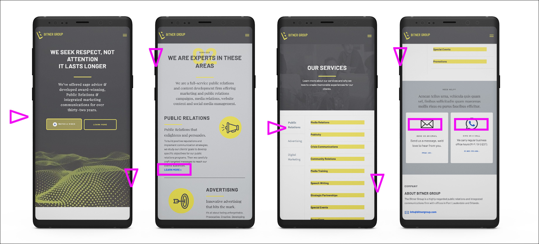 As the first step of the redesign process, I evaluated the existing website with a heuristic review method. I took the site through a user journey emulating a potential client looking for missed opportunities on conversion, quality of content and mobile friendliness.